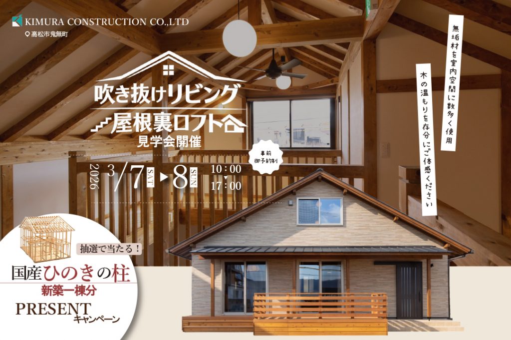 「吹き抜けリビング × 屋根裏ロフト」木のぬくもりを体感する見学会|鬼無町