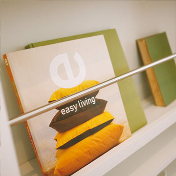 2階の共有スペースに棚を設けて、子供の絵や写真を飾るギャラリーに。閲覧室にも。