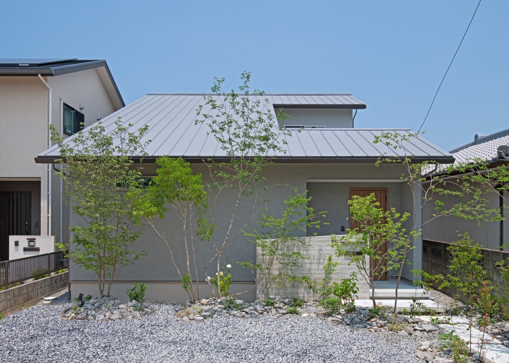 外壁には塗り壁を使用し、大屋根をかけることで、落ち着いた佇まいとなりました。