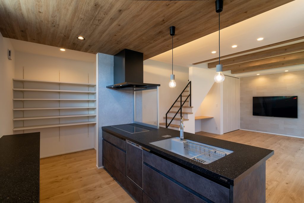 室内は、多様な収納スペースを設け、生活の利便性を考慮した設計がなされています。LDKはリビングの天井の高さを上げることでアクセントで梁を見せ、キッチンは間接照明によりデザイン性のある空間になっています。キッチン、パントリー、バスルーム、ランドリールーム、WICは近くに配置し、家事をしやすい動線になっています。