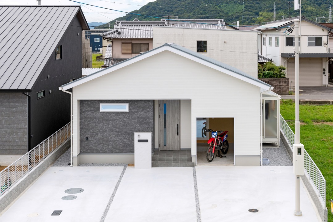 バイクガレージのある平屋 愛車のメンテナンスを思う存分できる空間を実現しました。 全体的にオフホワイ…